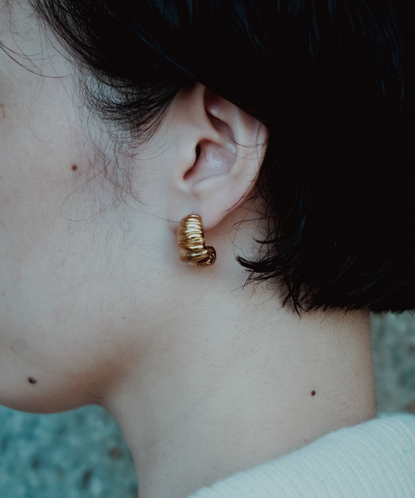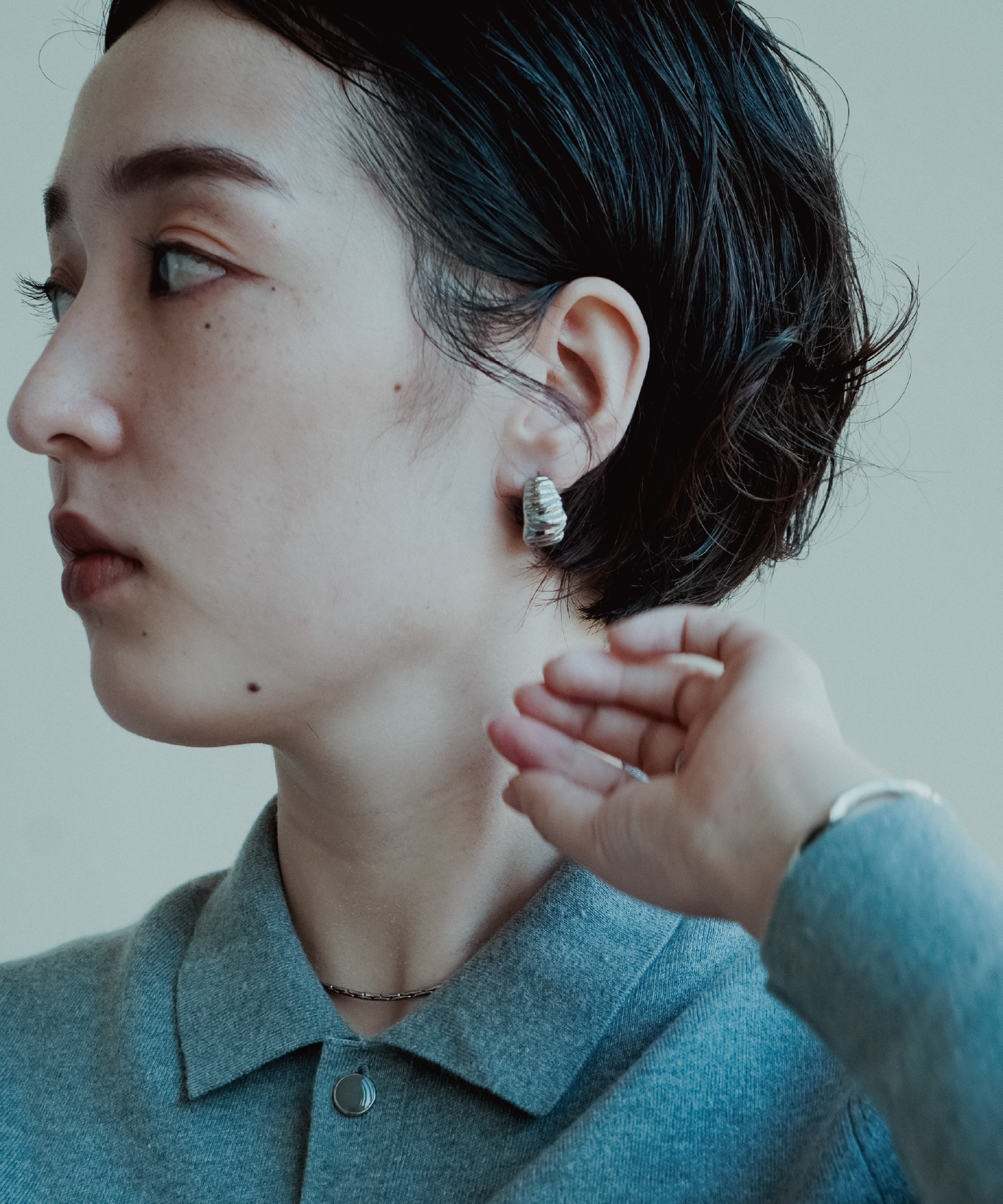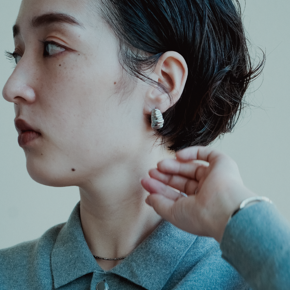 コンパクトながらしっかりとした厚みと光沢感で、耳元に強いアクセントをプラスします。