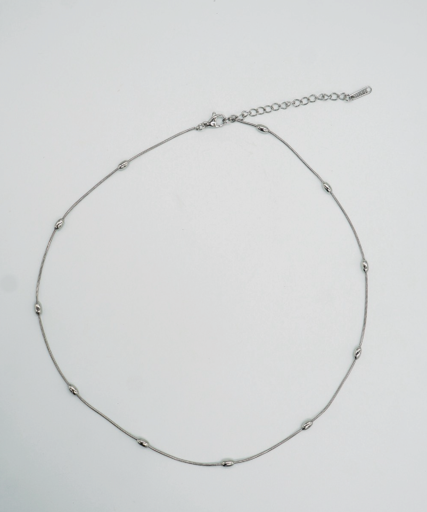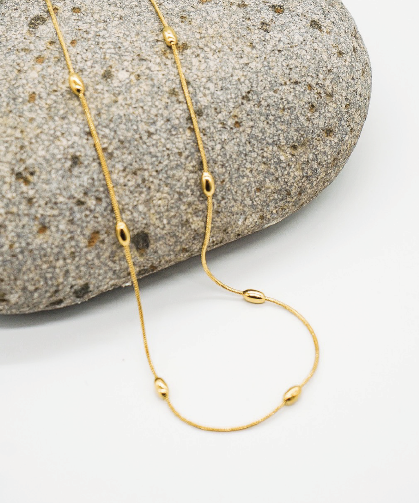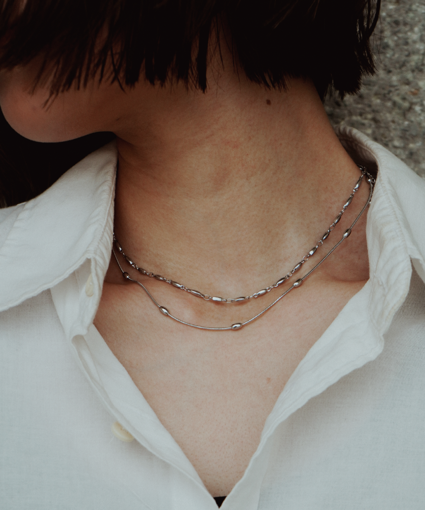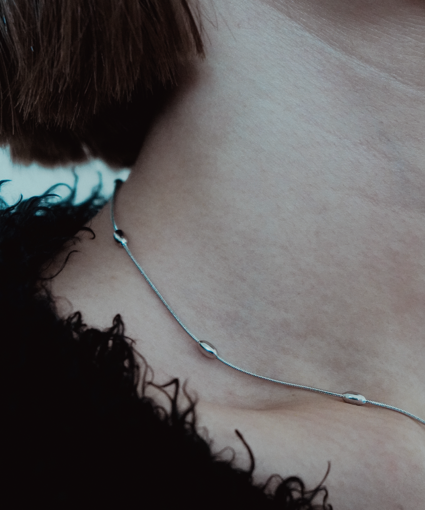 素肌にそっと溶け込む、繊細なゴールドのライン。極細チェーンにリズムよく配された小さなビーズが、首元に静かな輝きを添えます。主張しすぎないのに、ふとした仕草で光を捉える存在感。一日の始まりから夜の装いまで、シーンを選ばず寄り添うネックレスです。重ねづけにも美しく、ひとつでも完成するバランス。毎日身につけたくなる軽やかさと、gávoらしい凛とした強さをあわせ持った一本です。